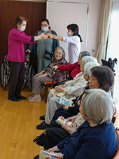 入居者の中にはむすびと一緒に毎日洗濯物をたたんでくださる方もいます。その方々にとっては生活リハビリであり、社会参加であり、健康な暮らしに無くてはならない大事な日課です。その方々は自分にできることで人の役に立てるという喜びを私たちに教えてくださいます。毎年「洗濯たたみ感謝の会」として、いつも手伝って下さる方にむすびからお礼の品をプレゼントしたり、お楽しみ会を企画したりしています。