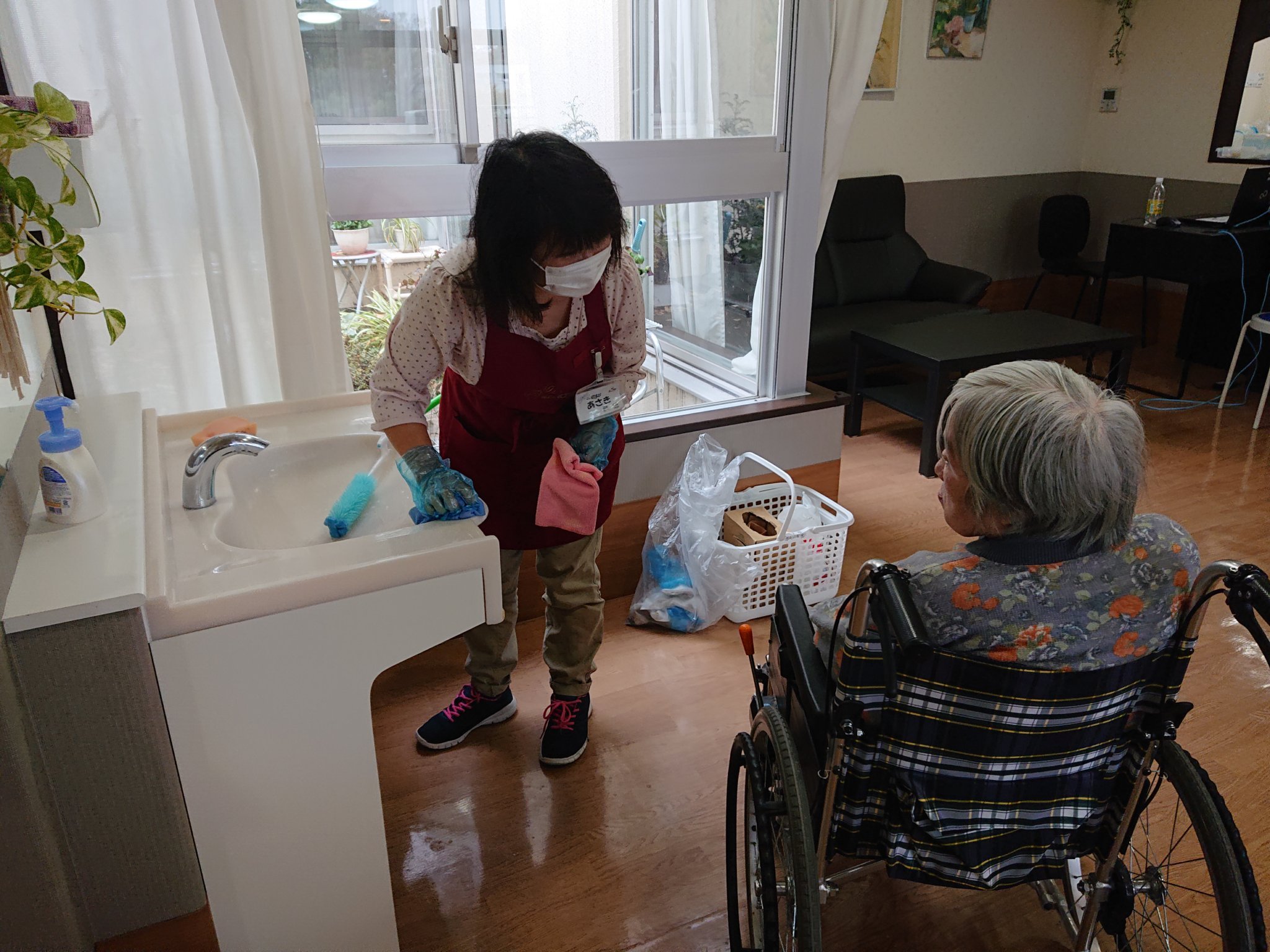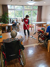 入居者・利用者の居室やリビングを清掃しながら見守りもしています。