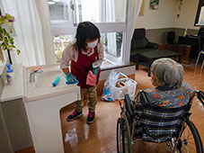 2009年、特別養護老人ホーム「ラポール三ツ沢」開設に合わせて、ライフサポートワーカーズ・コレクティブむすびは発足しました。むすびは入居者が自宅と同じように安心して暮らせる住まいとなるよう、職員と協働しています。主な仕事は清掃と洗濯ですが、それを通して入居者の身の回りのちょっとした困りごとに対応しています。直接介護はできませんが、日々接する中で入居者の望まれていることを察知し、様々なサービスに繋げてきました。売店や買い物代行、傾聴、お散歩の付き添い、衣類の補修やタンスの整理、カフェの開催、季節に合わせた施設内の装飾、施設行事のお手伝いなど、いつも近くにいるからこそわかる入居者の状態に合わせた対応を心がけています。