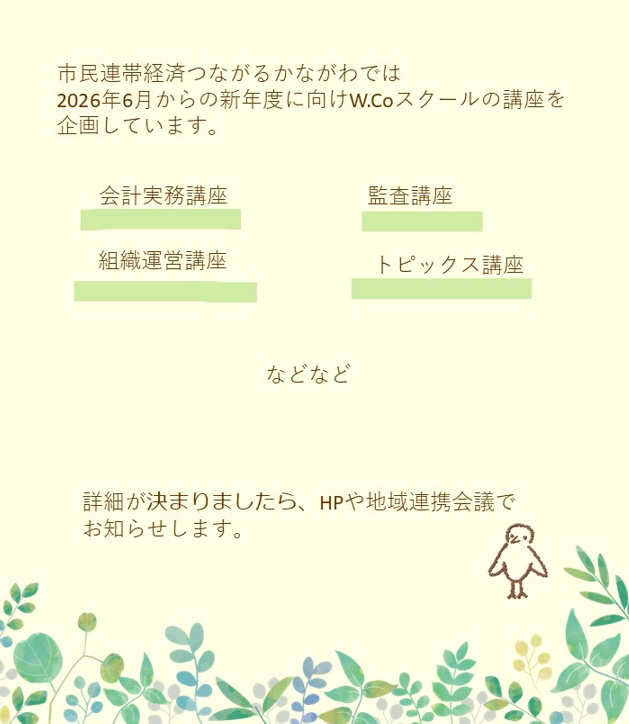 お知らせ 26年度W.Coスクールについて 2026.03.01 2026.04.01 お知らせ Post Share Hatena Pocket RSS feedly Pin it 記事のタイトルとURLをコピーする 都筑:2月24日(火)地域で働く説明会を開催します 前の記事 26年度つながるかながわ生活クラブまちづくり基金の募集要項を公開しました 次の記事 新着のお知らせ 26年度つながるかながわ生活クラブまちづくり基金の募集要項を公開しました 2026.04.01 都筑:2月24日(火)地域で働く説明会を開催します 2026.02.09